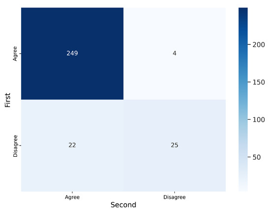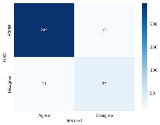 As in the first validation, we analyzed intra-observer variability by randomly presenting 300 segmentations (100 per labeler) to V2 twice. Figure 13 and Figure 14 display the confusion matrices for V2’s first and second evaluations of these segmentations. The results indicate that V2 was consistent in the majority of cases but less consistent than V1. Table 5 summarizes the corresponding metrics.
