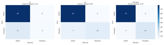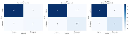 Further analysis of the intra-observer confusion matrices (Figure 5), which reflect the consistency of each validator’s repeated assessments using binary labels (Agree vs. Disagree), reveals that the segmentations originally labeled by L1 exhibit the lowest intra-observer agreement. This indicates that the validator (V1) was less consistent when evaluating L1’s segmentations, potentially due to greater variability or ambiguity in those masks. In contrast, CM-YNet’s segmentations, although not always labeled as correct, were assessed more consistently by V1 across repeated validations. These results suggest that consistency in evaluation may not always align with accuracy and that model-generated masks can elicit more reproducible judgments even if they are more frequently judged as incorrect.
