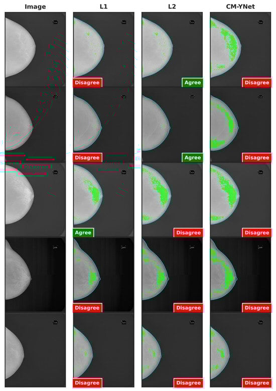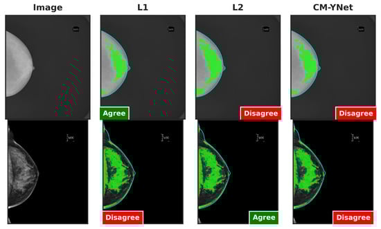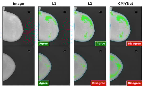 Figure 9 presents examples of images segmented by CM-YNet where V1 disagreed with the automatic segmentation in both evaluations of the same segmentation. This disagreement was observed in 16 out of 300 images, as depicted in Figure 8. Notably, these images were acquired using older devices (HOLOGIC and LORAD in Figure 3), which could explain the increased difficulty in accurately segmenting these lower-quality images, even for expert annotators.