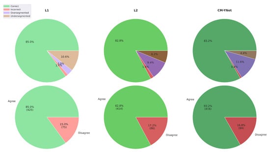 Figure 12 illustrates the agreement percentages between V2 and each evaluated labeler (L1, L2, and CM-YNet). The results indicate that the agreement percentage is comparable between manual segmentations—L1 () and L2 ()—and the automatic segmentation CM-YNet (). This percentage accounts for all segmentations (1500 in total). Notably, the primary source of disagreement varies across labelers: undersegmentation is the main cause of disagreement with L1, whereas oversegmentation is predominant with L2 and CM-YNet. These findings highlight a higher level of agreement between V2 and the automatic segmentation compared to the results from the first validation (Figure 5).