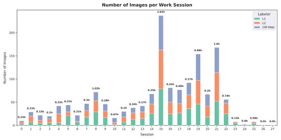 Summary of V2’s labeling sessions, showing the duration and number of images labeled in each session.