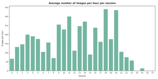 Finally, we wanted to explore whether the evaluation sessions influenced V2’s results. To this end, an analysis of the validation sessions was conducted. A session was defined as a continuous period during which V2 reviewed images without taking extended breaks. A break of more than one hour marked the start of a new session. A total of 28 sessions were identified (Figure 18), with the longest session lasting nearly three hours. Notably, the final two sessions each consisted of labeling only one image, with a duration of approximately one minute.