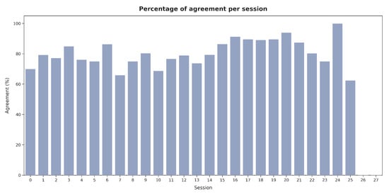 Figure 19 presents the average number of images labeled per hour across sessions. Shorter sessions showed a tendency toward the faster validation of images, while in longer sessions (e.g., sessions 15 and 21), V2 spent more time evaluating each image. However, as illustrated in Figure 20, no significant relationship was observed between the labeling speed in different sessions and the agreement percentage with the presented segmentations.