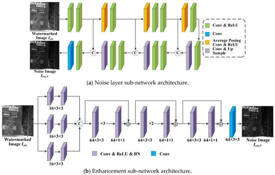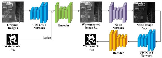 The proposed IRE robust watermarking network (IEWNet) uses the encoder–decoder structure to embed and extract the watermarking information, respectively. Before the watermarked image is fed to the decoder, the noise layer or enhancement module simulates traditional or machine learning IRE algorithms to process the watermarked image. This section first introduces the network structure of the proposed IEWNet. Next, the details of training IEWNet are described in terms of loss function and training process. The general architecture of the proposed IEWNet is shown in Figure 1. The original infrared image is first input to the UDTCWT [16] network for preprocessing and is embedded with the watermark Win by the encoder . Then, the noise network outputs the watermarked image Iem as the noisy image . Finally, the UDTCWT [16] network and the decoder extract the watermarking information from the noisy image .