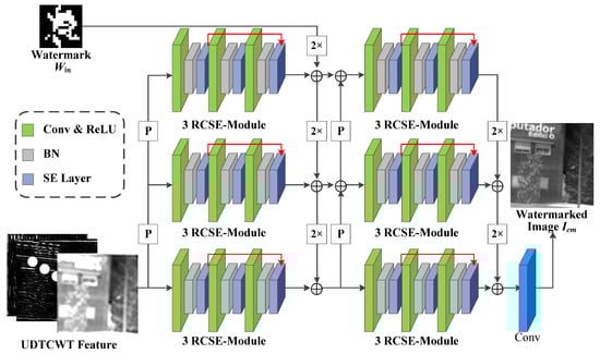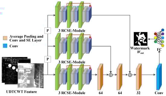 - Encoder : Figure 3 shows the network structure for the encoder , where “P” stands for 2 × 2 average pooling operation, “2×” stands for 64 × 3 × 3 doubly expanded convolutional layers, and (+) indicates the addition operation used to sum the features at each scale. Encoder aims to encode the input UDTCWT [16] features with the original IR image into a fixed dimensional tensor and to extract multi-scale image features while reducing the dimensionality of the input. The structure of encoder is generally divided into three scales. On the one hand, the UDTCWT [16] subnet extracts features after one or two 1/2 downsampling to form three dimensionality-decreasing features. On the other hand, a doubly extended convolutional layer can scale the watermarked image to twice or four times its size. Then, their sizes at these three scales will be in equal relationship. This will facilitate the combination of features at different scales with the help of downsampling and upsampling operations as illustrated in Figure 3. The inter-scale feature fusion will preserve more features from the original image during the model training process, which will improve the imperceptibility of the encoder . The Residual Convolutional SE (RCSE) module is a residual network structure consisting of three SE-Conv sub-blocks. The structure of the SE-Conv sub-blocks is based on channel attention module proposed by Cao et al. [46]. The ReLU activation function is capable of applying nonlinear operations on the model weights. The BN operation reduces the covariate bias of the model weights. After the tensor is processed sequentially by the 3 × 3 convolutional layer, ReLU activation function, and BN operation, the channel attention module is able to adjust the weights of the image watermark’s feature in different channels according to the important relationship between the channels. The attention module first reduces the dimension of the tensor to one dimension using the global average pooling algorithm. Then, two sets of Fully Connected (FC) layers with activation functions adjust the one-dimensional tensor. Finally, the output of the attention module is multiplied by the input tensor to achieve the final result. After the encoder obtains the sum of the features at each scale, it outputs the watermarked IR image through a 64-dimensional 3 × 3 convolutional layer.