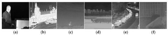 Sample IR images from the six datasets. (a) GTOT, (b) Road-Scene, (c) TNO, (d) LasHeR, (e) RGBT210, (f) RGBT234.