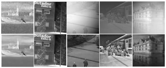 To verify the effectiveness and generalization of the proposed IEWNet, we select six public IR image datasets in Figure 7: GTOT [40], Road-Scene [41], TNO [42], LasHeR [43], RGBT210 [44] and RGBT234 [45]. These datasets include human infrared images in both indoor and outdoor environments. And the infrared images of outdoor environments are also available for buildings and vehicles in the city as well as in the field. These infrared images are taken during the day and night. They cover lots of situations in time and space. They form a total training set for model training. These datasets have both visible and IR images at the corresponding time. Since our model is proposed to overcome IRE attacks, we only consider IR images from these six datasets. First, the IR images are randomly filtered, cropped or scaled and then the image size is adjusted to 128 × 128. Figure 7 illustrates sample images from six datasets. In order to ensure good model training effect, we control the ratio of the number of infrared images between the training set and the test set at 4:1. and with reference to the number of images in various datasets, this paper screens different numbers of infrared images for each dataset. The training set of the six datasets has 80, 160, 80, 160, 160, 160, and 80 images, respectively. The number of images in the test set is set to be 1/4 of the training set. The watermarking information is an image consisting of a 256-bit with 0,1 sequence. In training the enhancement module of the noise network , 100 IR images are randomly selected from the four algorithms presented in [36,37,38,39] as the training set. The settings of this training set are consistent with the six datasets. Figure 8 illustrates five IR images from the training set of the augmented sub-network. All experiments are conducted on a computer Dell OptiPlex 7070 with an Intel(R) Core(TM) i7-9700 CPU processor and with NVIDIA GeForce GTX 1660 graphics card from Randrock, Texas, USA. Furthermore, we use MATLAB R2016a and PyCharm 2020.3.3 to build our proposed network. In experiments, our model is trained on 100 epochs using Stochastic Gradient Descent (SGD) with a momentum of 0.9, a batch size of 1, and the initialization learning rate and weight decay rate are set to 0.001.