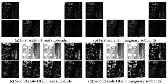 The UDTCWT [1] extracts high-frequency subbands at different scales from the IR image in a total of six directions at ±15°, ±45°, and ±75°. In this paper, the application of the secondary UDTCWT [16] transform produces two scales. We take the second original IR image in Figure 9 to train UDTCWT [1] network , and all the high-frequency (HF) and low-frequency (LF) subbands are shown in Figure 9.