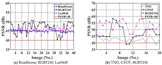 The imperceptibility of the proposed algorithm is evaluated by using PSNR. The PSNR value quantifies the degree of loss in image quality. The higher the PSNR value is, the higher the quality of the watermarked IR image , and the watermarked IR image tended to be more similar to the original IR image . Figure 10 shows PSNR values of the test set for six IR images datasets, where the horizontal and vertical coordinates of each graph represent the image serial number and the corresponding PSNR value of the image, respectively. We choose PSNR = 40 as the standard line for evaluating image quality.