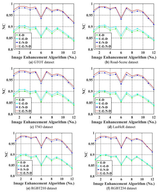 To verify the effectiveness of the proposed model components, we conduct a series of experiments according to the impact of UDTCWT [16] network and noise network on robustness. First, we remove UDTCWT [16] network and noise network from the proposed framework IEWNet, and then we test the robustness of the remaining structures against IRE attacks. Figure 11a–f shows Normalized Correlation (NC) values (as calculated in Equation (7)) of thewatermark extraction for different model structures on the six test datasets, respectively. The horizontal axis of the images represents the eight traditional-based IRE algorithms and four machine learning-based IRE algorithms in order.