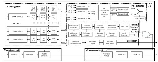 The “ORB unit” consists of a RAM-based shift registers block that holds image data of a 27 × 27 image patch around the pixel of interest. This block makes image data available concurrently to the next three blocks that are used for feature detection and description. Feature detection consists of the “FAST detector” and the “Harris & Stephens corner detector”. The outputs of both blocks are OR-ed together to produce the “Feature” indicator bit. The “Descriptor” block calculates the descriptor bit string for every pixel; however, it is outputted appropriately only when a pixel constitutes a feature.