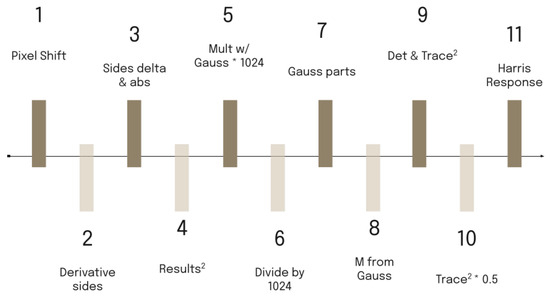 Regarding convolution between the second moment matrix and a 3 × 3 Gaussian kernel, nine floating point multiplications are required. Each element of the Gaussian kernel is a floating point number since the kernel is normalized. A power of two is selected and each element of the Gaussian kernel is multiplied by that power of two. Each product is approximated to the nearest integer. The convolution takes place with the multiplications between the corresponding elements of the second moment matrix and the integer elements of the Gaussian kernel. Each product can be accumulated, and the final sum is divided by the power of two performing right bit shifts to produce the final result. A significant detail that played a crucial role in our design was the order of accumulation and division. If the accumulation of the products between the kernel and the second moment matrix elements is applied first, and the division is applied afterwards, more accurate results are produced, but larger adders are required causing longer propagation delays in the data path. If division by a power of two precedes the accumulation, less accurate results are produced, but smaller adders are required so that it shortens the propagation delay in the data path. Since the system has a strict requirement to support full-HD image resolution at 60 fps, the second approach was chosen. Otherwise, more pipeline stages should have been added in the Harris response calculation. Moreover, the selected approach saves resources from the FPGA chip by using smaller adder circuits.