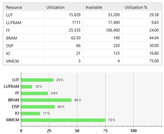 In Figure 16, the resource usage of the FPGA is presented. As can be seen, less than 30% of the LUTs, FFs, and DSPs of the Zynq chip have been reserved for the proposed implementation. BRAM utilization reaches 45% since large buffers that store 26 image rows of 1920 pixels each are required. The current usage of resources let the larger part of the chip unoccupied. This is quite encouraging since there are still pending steps for the SfM process to be implemented completely.