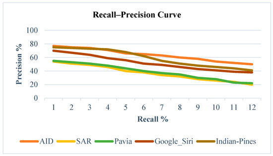 The graph in Figure 3 depicts the recall–precision curve generated for various datasets using the proposed hybrid retrieval technique. Notably, positive results are considered only when the outcome belongs to the same semantic category as the query. The statistical analysis is conducted on 300 images across 30 distinct categories, with the first 100 retrieved image patches taken into account. SAR and Pavia images exhibit suboptimal performance, primarily due to skew noise, which, even after denoising, diminishes essential features. Conversely, AID and Indian Pines outperform others, as high-resolution hyperspectral images are less affected by environmental noise, enabling effective global region similarity measurements. Detailed results are available in [34].