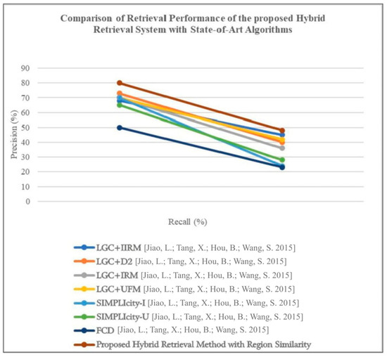To assess the efficacy of the proposed hybrid retrieval method in comparison to existing retrieval algorithms, a precision–recall graph is plotted as shown in Figure 4, evaluating various techniques on online datasets. The compared retrieval techniques include the FCD method [Jiao, L.; Tang, X.; Hou, B.; Wang, S., 2015] [35], which calculates similarity using the fast compression distance algorithm; SIMPLIcity-I [Jiao, L.; Tang, X.; Hou, B.; Wang, S., 2015] [35], classifying image patches into semantic groups and computing similarity using the IRM distance measure; SIMPLIcity-U [Jiao, L.; Tang, X.; Hou, B.; Wang, S., 2015] [35], employing the UFM distance measure; and Local Gradient Coding (LGC) with different distance measures, such as IRM, UFM, and D2.
