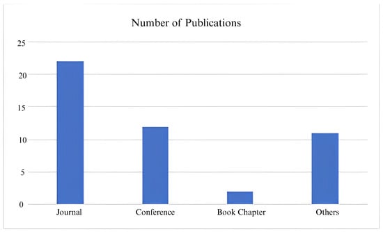 Figure 1 presents the number of publications by year, highlighting a noticeable increase in research activity on Human Activity Recognition (HAR) in recent years, with a particularly sharp rise from 2020 onwards. The year 2024 recorded the highest number of publications, reflecting the growing academic focus on multi-view HAR systems and lightweight deep learning applications in Ambient Assisted Living (AAL). Complementing this, Figure 2 categorizes the selected publications by type, indicating that journal articles constitute the majority, followed by conference proceedings, book chapters, and other sources such as preprints and dataset reports. This distribution emphasizes the predominance of peer-reviewed journal publications in advancing HAR research while also demonstrating the valuable contributions from diverse publication platforms in this rapidly evolving field.