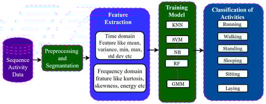 The data segments obtained from the previous step are used for feature extraction, the most important stage in the Human Activity Recognition (HAR) pipeline. Feature extraction may be manual or automatic. Machine learning-based methods adopt these pipelines of data acquisition, data preprocessing and segmentation, feature extraction with hand-crafted features, feature selection, and finally, classification [55] depicts in Figure 3.