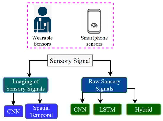 Machine learning has attracted researchers to explore deep learning models for Human Activity Recognition (HAR) due to their potential for high reward. Figure 4 illustrates the HAR using DL approaches for feature extraction and classification. These models are usually categorized based on the input data they receive [26]. Figure 5 illustrates the categorization of deep learning models based on the type of sensory signals acquired through wearable sensors and smartphones for Human Activity Recognition (HAR). The sensory data are classified into two main types: imaging of sensory signals and raw sensory signals. In the case of imaging, sensor data are transformed into visual representations such as spectrograms or encoded plots, which are then processed using Convolutional Neural Networks (CNNs) to extract spatial features. For raw sensory signals, the data are directly fed into models without transformation. CNNs are used to capture local dependencies, Long Short-Term Memory (LSTM) networks are applied to learn temporal patterns in sequential data, and hybrid models combine multiple architectures, such as CNN-LSTM combinations, to leverage both spatial and temporal features. This categorization highlights how the nature of the sensory input influences the choice of deep learning architecture, guiding the development of accurate and efficient HAR systems, particularly in resource-constrained Ambient Assisted Living (AAL) environments. The HAR pipeline can be simplified with deep learning (DL) methods. DL has been shown to achieve outstanding empirical performance in many applications such as image synthesis, image segmentation, image classification, object detection, activity recognition, and human gait analysis [56]. DL algorithms are composed of multiple abstraction levels constructed through the neurons. Feature maps are obtained from the input feature maps of the preceding layer through the non-linear functions of each layer. Hierarchical abstraction enables DL algorithms to learn one level-specific feature for each domain of application. Deep learning uses a Deep Neural Network (DNN) architecture where a specific loss function is optimized for feature extraction as well as determination of the classification boundaries [57].