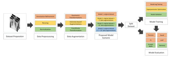 All images were preprocessed by resizing them to a uniform dimension of 800 by 800 pixels using bilinear interpolation. This resolution was selected to maintain anatomical fidelity while ensuring compatibility with the input constraints of the YOLOv8 model. Pixel intensity normalization was performed using min–max scaling to map grayscale values into the [0, 1] range [,]. This normalization step facilitated model convergence and stabilized the training process.