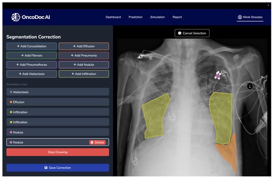 The quality and granularity of annotations play a pivotal role in the training and evaluation of deep learning-based medical segmentation models. The original NIH Chest X-ray dataset used in this research provides only image-level labels without pixel-wise delineation of abnormalities. These coarse annotations are insufficient for supervised semantic segmentation, particularly when the objective is to accurately localize and classify overlapping thoracic pathologies. To address this limitation, a multi-stage annotation refinement protocol was employed to generate clinically validated segmentation masks. This process involved expert radiologists using OncoDocAI (ai.oncodoc.id), a web-based annotation platform that supports pixel-wise, multi-label correction. The platform enables precise boundary marking and the assignment of multiple overlapping labels within the same region, improving both spatial accuracy and label specificity. An example of the annotation interface and its multi-label capabilities is shown in Figure 2.