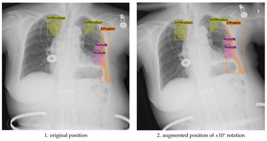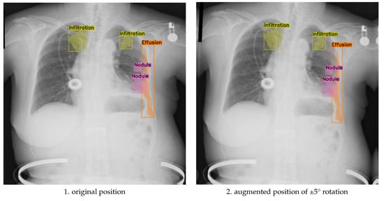 Data augmentation strategies in medical imaging have progressed beyond basic geometric transformations to encompass sophisticated techniques that preserve clinical validity. Recent research has explored various augmentation methods tailored to chest X-rays, ranging from conventional geometric transformations to advanced intensity-based modifications [,]. While traditional data augmentation methods like rotation and scaling have proven effective in general computer vision, their application in medical imaging demands careful consideration of anatomical constraints [,]. Researchers have investigated the impact of different augmentation strategies on model performance, emphasizing the preservation of diagnostic features []. Intensity-based augmentations, such as contrast adjustment and noise addition, have been shown to improve model robustness to variations in image acquisition conditions [,,]. However, determining optimal augmentation parameters that enhance performance without introducing artifacts that compromise diagnostic accuracy remains a challenge. For example, excessive rotation can obscure anatomical structures, while insufficient augmentation may not provide sufficient variability for effective learning [].