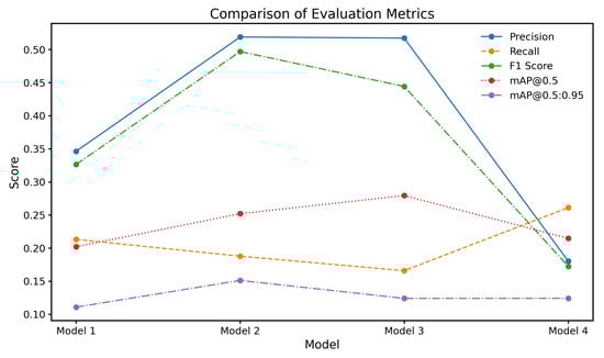 Precision was defined as the proportion of correctly identified pixels among all predicted pixels for a given class, while recall measured the proportion of correctly identified pixels among all actual class pixels. The F1-score, representing the harmonic mean of precision and recall, provided a balanced performance measure, particularly valuable in imbalanced datasets. For a more granular assessment, mAP was calculated across multiple Intersections = over Union (IoU) thresholds. Specifically, mAP@0.5 used a fixed IoU threshold of 0.5, while mAP@0.5:0.95 averaged the AP across thresholds ranging from 0.5 to 0.95 in 0.05 increments. The former offered a standardized benchmark, whereas the latter captured the model’s ability to segment regions with varying degrees of overlap with the ground truth.