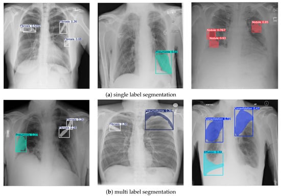 The results of chest X-ray segmentation using the enhanced NCT-CXR framework are presented in Figure 6, with Figure 6a showing single-label segmentation outcomes and Figure 6b displaying multi-label segmentation results. In Figure 6a, the model demonstrates its effectiveness in detecting individual pathological conditions with high accuracy. The first image illustrates fibrosis segmentation, supported by strong confidence scores that confirm the reliability of the prediction. The second image highlights pneumonia detection, where the model clearly delineates the affected region. The third image shows accurate identification of nodules, further validated by high confidence values. In Figure 6b, the model’s capability for multi-label segmentation is demonstrated through its successful identification of multiple co-occurring abnormalities within a single image. The first example shows the segmentation of both fibrosis and pneumonia, while the second image depicts fibrosis and pneumothorax. The third example highlights the detection of effusion and pneumothorax, each with clearly defined masks and confidence scores. These outcomes reflect not only the efficacy of the YOLOv8 segmentation backbone but also the contribution of the compound, spatially aware augmentation strategy in supporting multi-label generalization across diverse thoracic conditions.