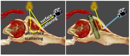Shadow generation often encounters the phenomenon of “self-occlusion,” when using VPT in volumetric data containing implicit surface structures, as illustrated in Figure 2. For surface model rendering, light reflected from objects captured by the virtual camera includes both surface and subsurface scattering [13]. However, in DVR, sampling rays traverse implicit surfaces within the volumetric data, where the light received by sampling rays is obstructed by these implicit surfaces, resulting in darkened rendering outcomes.