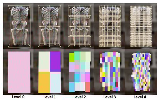 When the transfer function changes, the acceleration structure should be updated. To achieve more accurate updates while accommodating various forms of transfer functions, a new update process is designed, as illustrated in Figure 4. First, leaf nodes are updated in parallel using CUDA, with each leaf node assigned a separate CUDA thread. Each thread traverses all voxels within the leaf node and updates the maximum extinction coefficient based on the extinction coefficient calculated from the transfer function. For levels higher than level 4, CPU parallel updating is employed, while higher levels continue to use CUDA. Nodes from Level 5 nodes are copied to CPU memory for updating the higher-level hierarchy. This update strategy enables the maximum level 7 volumetric octree to be updated in just 15 ms for resolution data, meeting real-time requirements. Figure 5 shows an example of the multi-hierarchical volumetric grid. The first row shows the volumetric spatial range of each node at different levels, while the second row visualizes the nodes containing valid voxels (those with opacity greater than 0) at each level.