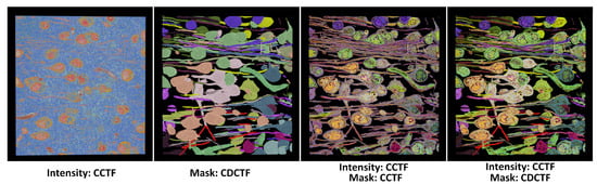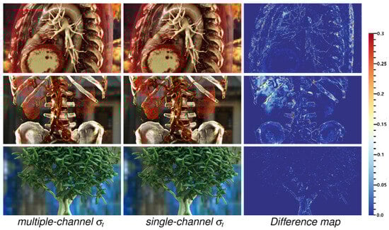 When multiple transfer function types are applied to a single volumetric dataset, their compatibility must be considered. For instance, in VTK [62], multi-dimensional transfer functions compute target coefficients by multiplying the coefficient calculated in each dimension. In cases of conflict between two types, a priority must be established. For example, in DVR of segmented results, if the original volume employs a CCTF and the mask volume uses a MDPTF, the classification method can be set to prioritize MDPTF when the opacity controlled by MDPTF exceeds zero; otherwise, CCTF is used as the classification method. As shown in the right image in Figure 7, classification using the material transfer function and coefficient transfer function simultaneously yields a visualization with significantly greater detail compared to simple coefficient multiplication.