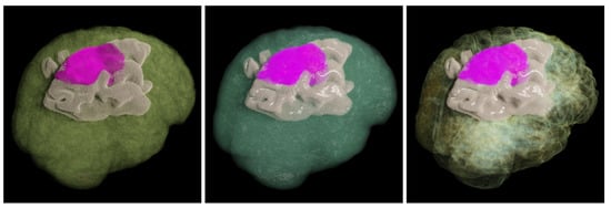 The visualization of brain tumors and tissue edema is presented. The left and middle images employ a two-dimensional transfer function, applying the same type of transfer function to both the original volume and the mask volume, resulting in the target material coefficients through their multiplication. In contrast, the right image utilizes different material types for different mask values and applies the CCTF to further classify the coefficients for each material type.