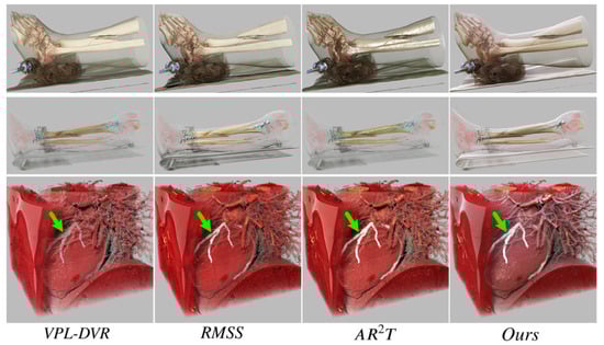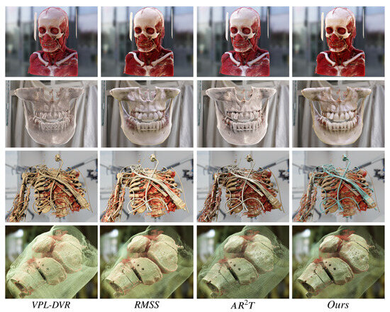 The most important application scenario for realistic DVR is medical image visualization, where the rendered results need to be as beneficial as possible for medical use. In this section, the advantages of our system over SotA methods in preoperative surgical planning are demonstrated. While numerous approximation and acceleration techniques have been recently developed for DVR [43,44,51,52], our comparison primarily focuses on the rendering technology. Technologies that are not compared are mainly designed for real-time acceleration rather than enhancing visualization quality; thus, they are not directly compared. The proposed system also implements schemes for real-time browsing: Supplementary Materials include scenes reconstructed using neural rendering techniques, demonstrating real-time browsing effects achieved with NeRF and 3DGS technologies.