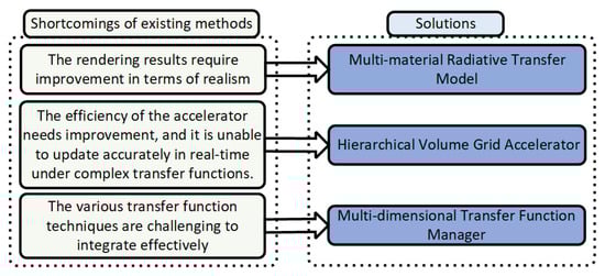 Our research tries to extend the RTE to support realistic DVR for physically based visualization of multiple materials. Realistic DVR results generated using our method are depicted in Figure 1; unless otherwise specified, the datasets utilized in this paper are sourced from [36,37]. Our contributions include: