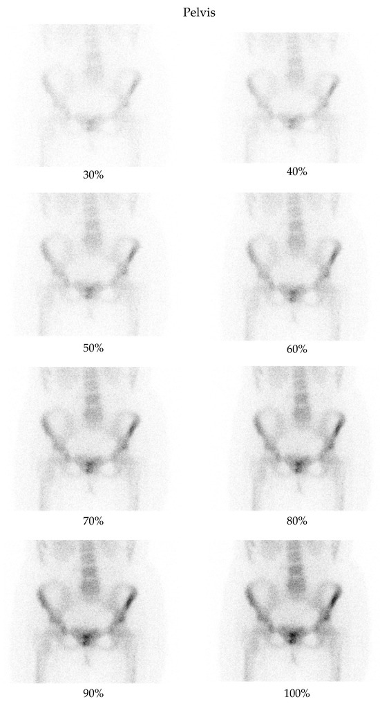 Bone scintigraphy planar images of the pelvis, showing an example of degraded low-dose images as compared with the corresponding full-dose image.