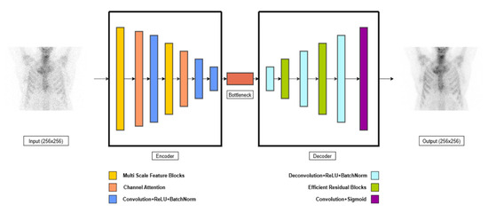 Convolutional Autoencoders are widely used in denoising applications for medical imaging due to their ability to learn efficient representations of image structure and suppress noise while preserving anatomical content [12,15]. The proposed Enhanced Convolutional Autoencoder (ECAE) (Figure 3) is designed to extract relevant features and reconstruct high-quality bone scintigraphy images from low-dose inputs [17]. The encoder consists of multi-scale feature extraction blocks (MSFBs), which apply parallel convolutional layers with varying kernel sizes (3 × 3, 5 × 5) to capture both fine-grained and contextual features [18]. Larger kernel sizes (e.g., 7 × 7 or 9 × 9) were not used to avoid excessive smoothing of fine structures and to maintain computational efficiency [19]. A channel attention mechanism is integrated after each MSFB, dynamically recalibrating feature importance through global average pooling (GAP) and fully connected layers with sigmoid activation [20] allowing the model to emphasize diagnostically relevant features. Instead of using traditional max pooling, strided convolutions are employed for downsampling. This choice preserves learnable spatial transformations and helps reduce information loss during compression, which is particularly important in medical imaging where anatomical fidelity is critical [21]. A 1 × 1 convolutional bottleneck compresses the latent feature map and facilitates efficient feature blending across channels; this is followed by a ReLU activation to introduce non-linearity and preserve learning capacity in the latent space. The decoder reconstructs the high-quality image using transposed convolutions. To prevent degradation of information across deeper layers, we incorporate efficient residual blocks (ERBs) within the decoder. These are termed “efficient” because they use depthwise separable convolutions and skip connections, reducing the number of trainable parameters while maintaining high expressiveness and stability during training. ERBs improve feature propagation and minimize gradient vanishing, leading to sharper reconstructions [22,23]. The final output is generated through a 3 × 3 convolution that produces the denoised grayscale image. The ECAE architecture was selected over more complex alternatives such as U-Nets, GANs, or transformer-based models due to its favorable balance between structural preservation, computational simplicity, and training stability. GANs are known for generating high-quality images but are more prone to training instability and hallucination effects, which can be problematic in clinical imaging [24,25]. U-Nets and transformers, while powerful, introduce significant parameter overhead and may be unnecessarily complex for the specific task of denoising [26,27]. In contrast, the ECAE offers interpretable feature representations and has proven to be efficient and robust under limited-data conditions, making it well suited for this clinical application [28]. This architectural design—combining multi-scale feature extraction, channel attention, residual learning, and bottleneck compression—allows the model to reconstruct diagnostically useful images with enhanced structural integrity and reduced noise, even at significantly reduced dose levels.