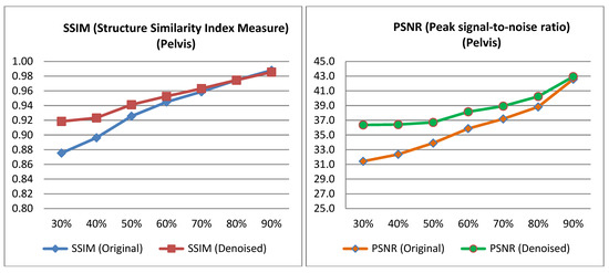 PSNR and SSIM variation across different low-dose percentages for pelvis images.