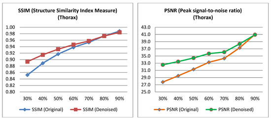 PSNR and SSIM variation across different low-dose percentages for thorax images.