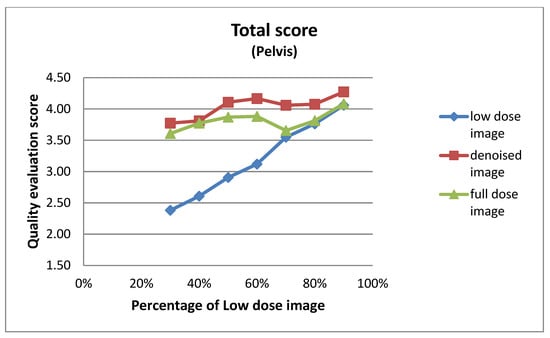 Total mean image quality scores across varying dose levels (30% to 90%) for pelvis images, as evaluated by two experts. Scores are averaged across four qualitative metrics: noise level, visibility of anatomical structures, preservation of image details, and overall diagnostic suitability. Three curves represent the low-dose images, denoised outputs, and full-dose reference images.