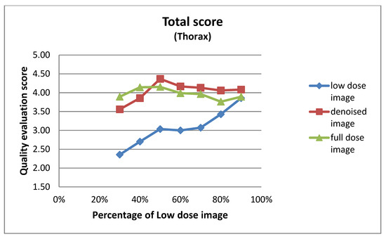 Total mean image quality scores across varying dose levels (30% to 90%) for thorax images, as evaluated by two experts. Scores are averaged across four qualitative metrics: noise level, visibility of anatomical structures, preservation of image details, and overall diagnostic suitability. Three curves represent the low-dose images, denoised outputs, and full-dose reference images.