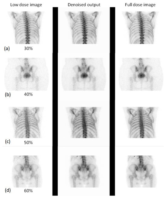 Interestingly, while our study focuses on planar bone scintigraphy and utilizes an autoencoder-like architecture, the quantitative improvements we observed—particularly in SSIM at low-dose levels (e.g., pelvis SSIM from 0.875 to 0.918 at 30% dose) (Table 2 and Table 3), are methodologically comparable to outcomes reported in PET denoising studies. For instance, Li et al. (2021) [13] and Ahmad et al. (2023) [47] demonstrated that GAN-based approaches can enhance image quality in PET by recovering fine structural details in low-dose conditions. Similarly, Gong et al. (2017) [48] introduced an early CNN-based denoising model for PET trained on full-dose/low-dose pairs, an approach echoed in our supervised learning strategy. Xu et al. (2017) [49] used deep residual networks to reconstruct PET images from ultra-low-dose inputs, underscoring the general potential of deep learning in extreme noise conditions. Hybrid approaches also show promise: Kim et al. (2018) [50] incorporated deep priors into PET image reconstruction, blending traditional and AI-driven techniques, while Katsari et al. (2021) [51] demonstrated successful deployment of AI-enhanced PET imaging in clinical workflows. In terms of clinical validation, Bonardel et al. (2022) [11] and Weyts et al. (2022) [52] both validated AI-based PET denoising algorithms in clinical and phantom settings, demonstrating significant improvements that allowed dose or time reductions without compromising diagnostic interpretability. While PET and planar scintigraphy differ in data characteristics and clinical usage, these studies highlight important methodological similarities, reinforcing the relevance and generalizability of deep learning-based denoising across nuclear medicine modalities. Our own observer-based evaluations show similar trends; for example, in pelvis scans at a 50% dose, over 90% of responses favored the denoised images compared to the original full-dose ones (Figure 9), suggesting not only recovery but potential enhancement of diagnostic quality. Collectively, these results support the general effectiveness and adaptability of deep learning-based denoising within nuclear medicine. Our study adds to this growing body of work by presenting a clinically validated, robust, and interpretable framework for dose and time reduction in planar bone scintigraphy. The model’s strong performance—achieved without adversarial loss or complex generative designs—emphasizes the importance of well-structured training datasets and comprehensive evaluation strategies in producing clinically meaningful outcomes.