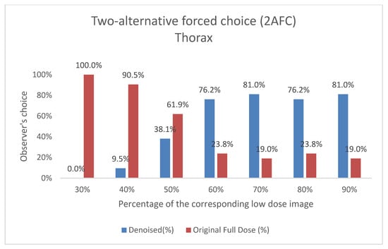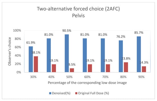 This subsection presents the results of the Two-Alternative Forced Choice (2AFC) evaluation conducted by Observer 3. In this blind test, Observer 3 was asked to choose between the denoised output and the original full-dose image based on overall preference, without knowledge of which image corresponded to each category. Figure 9 and Figure 10 show the results of this preference-based assessment, indicating the percentage of times the denoised output and the original low-dose image were selected across different dose levels for both the thorax and pelvis regions. The results demonstrate a clear preference for the denoised images, particularly as the low-dose percentage increases.