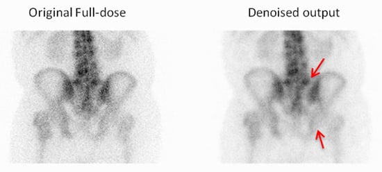 - Ramon, A.J.; Yang, Y.; Pretorius, P.H.; Johnson, K.L.; King, M.A.; Wernick, M.N. Improving Diagnostic Accuracy in Low-Dose SPECT Myocardial Perfusion Imaging with Convolutional Denoising Networks. IEEE Trans. Med. Imaging 2020, 39, 2893–2903. [Google Scholar] [CrossRef]