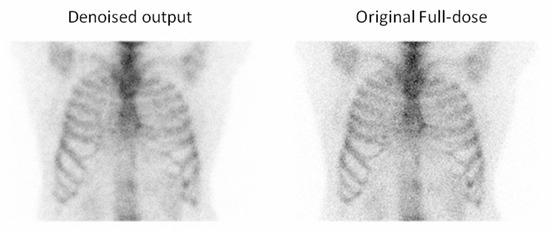 Bone scintigraphy planar images of the thorax, showing an example of degraded low-dose images as compared with the corresponding full-dose image.