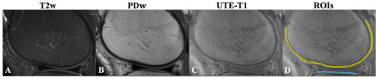 - Bae, W.C.; Biswas, R.; Chen, K.; Chang, E.Y.; Chung, C.B. UTE MRI of the Osteochondral Junction. Curr. Radiol. Rep. 2014, 2, 35. [Google Scholar] [CrossRef]