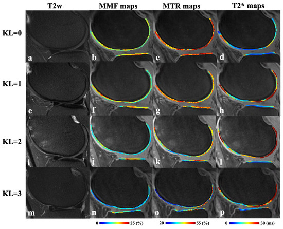 Representative fat-suppressed T2w-FSE (T2w) images (a,e,i,m) and corresponding MMF (b,f,j,n), MTR (c,g,k,o), and T2* (d,h,l,p) maps from four participants with varying degrees of KL scores. Top row (a–d): a 23-year-old male with normal cartilage (KL = 0); second row (e–h): a 57-year-old male with subtle cartilage changes (KL = 1); third row (i–l): a 52-year-old female with mild cartilage degeneration (KL = 2); bottom row (m–p): a 70-year-old female with moderate cartilage degeneration (KL = 3). T2w, T2-weighted fast spin echo; MMF, macromolecular fraction; MTR, magnetization transfer ratio.