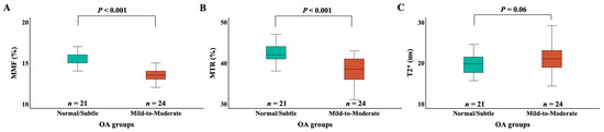 Figure 3 presents box plots of MMF, MTR, and T2* values across different OA groups. Patients with the normal/subtle OA group demonstrated significantly higher MMF (15.8 ± 1.4% vs. 13.6 ± 1.2%, p < 0.001) and MTR (42.5 ± 2.5% vs. 38.3 ± 2.9%, p < 0.001) values compared to those with the mild to moderate OA group. The normal/subtle OA group had lower T2* than the mild to moderate OA group but did not reach statistical significance (19.7 ± 2.6 ms vs. 21.6 ± 3.8 ms, p = 0.06).