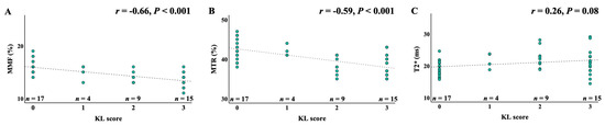 A correlation analysis between UTE-MRI biomarkers and KL scores is shown in Figure 4. MMF and MTR demonstrated significant negative correlations with KL scores (r = −0.66 and −0.59, respectively; p < 0.001), indicating that macromolecular content decreases with increasing OA severity. T2* values showed a weaker but statistically significant positive correlation (r = 0.26, p = 0.08), reflecting increased water content and disorganization in more advanced OA.