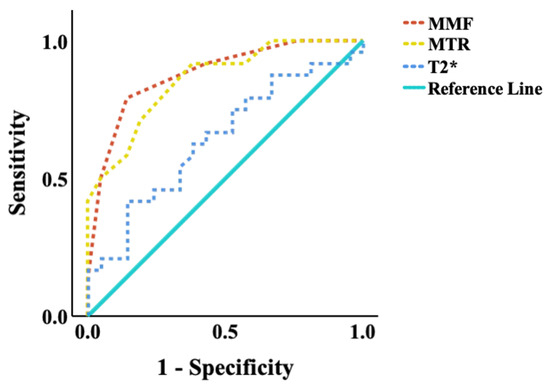 Spearman’s correlation coefficient was used to assess the relationship between MMF and MTR values and the clinical KL classification, as these variables did not meet the normality assumption. Pearson’s correlation coefficient was used to evaluate the correlation between T2* values and the KL classification, as T2* was normally distributed. Receiver operating characteristic (ROC) curve analyses were performed to calculate the area under the curve (AUC) for MMF, MTR, and T2* in distinguishing osteoarthritis severity. This analysis categorized OA grade groups as normal/subtle (KL = 0 and 1) and mild to moderate (KL = 2 and 3).