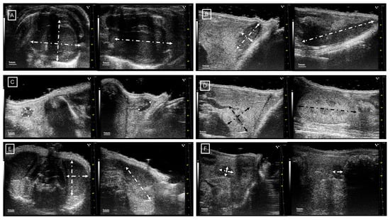 Representative images of ultrasound diameter measurements in (A) heart in axial (left) and longitudinal (right) views, (B) spleen in axial (left) and longitudinal (right) views, (C) inguinal lymph nodes in axial (left) and longitudinal (right) views, (D) left kidney in axial (left) and longitudinal (right) views, (E) left testicle in axial (left) and longitudinal (right) views, and (F) left ovary in axial (left) and longitudinal (right) views. In all cases, the diameters are marked with dotted, white, or black lines.