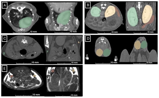 Representative images of manual segmentation in microCT studies. (A) Segmented heart in green in axial (left) and coronal (right) views, (B) left kidney in yellow, right kidney in green, and spleen in red segmented in axial (left) and coronal (right) views, (C) left (in green) and right (in yellow) lymph nodes in axial (left) and coronal (right) views, (D) left (yellow) and right (green) testicles in axial (left) and coronal (right) views, (E) left (orange) and right (yellow) ovaries in axial (left) and coronal (right) views.